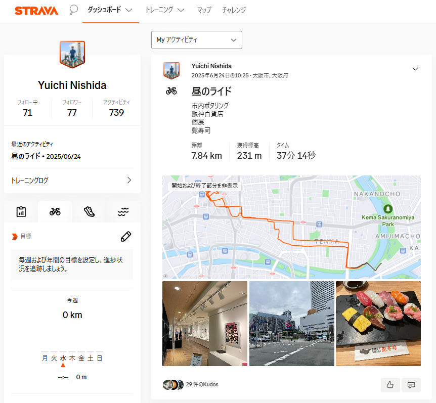 上の写真は↑こちらは西田のSTRAVAアカウントの画面ですが、自分のライドの記録を写真やログ、走行データで思い出としてアプリ内に残すことができ、その記録をシェアできるんですね。