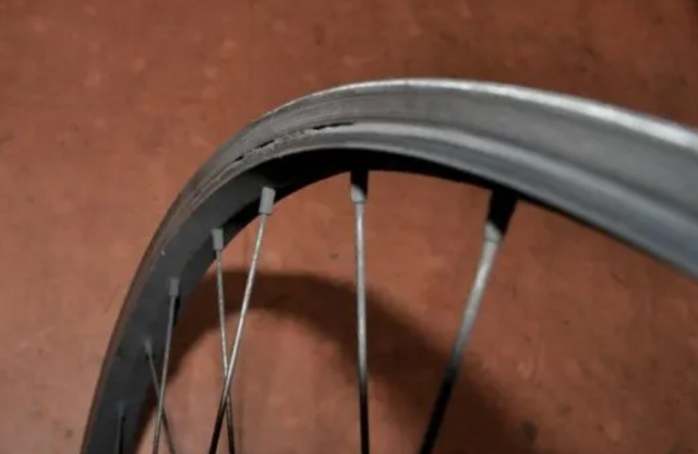 また、リムブレーキでは、ブレーキの度に多少なりともリム面を削ってしまっているために、ホイール自体の寿命も短くなってしまっています。劣化が進んでいくと下の写真のようにリム面が割れ、タイヤの空気圧に耐え切れなくなる可能性があり危険です。