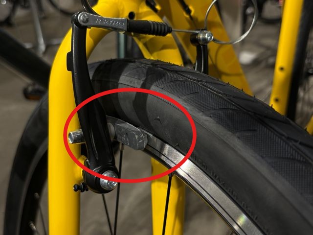リムブレーキのブレーキシューは、上の写真のように外から見えやすい構造となっています。消耗度合いが外から確認しやすく、交換時期が分かりやすいのです。「気付いたらブレーキシューが消耗し切ってしまっていて止まらない」といったことが避けられますね。