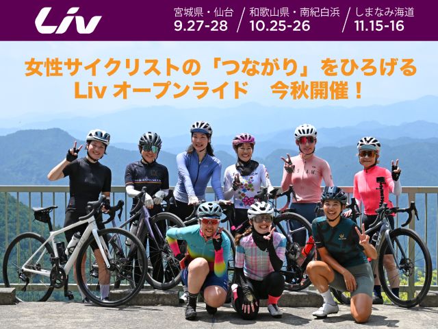 女性向け総合サイクリングブランド「Liv」では、女性サイクリストの交流と新たな出会いを目的とした「Livオープンライド」を、宮城県・仙台、和歌山県・南紀白浜、しまなみ海道の3か所にて開催いたします。