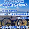 ジャイアントストア高松店の年内最終営業日は12月28日! 今年も残すところ2週間...!ジャイアントストア高松を何卒よろしくお願いいたします! こんにちは!ジャイアントストア高松店です✨年末年始のスケジュールをご紹介いたします! 通常営業:12月28日(日)まで 年末年始休業:12月29日(月)~1月3日(土) 営業再開:1月4日(日)~通常の火曜日定休 年始は4日の日曜日から営業いたします!お間違いなきようお気を付けください🥰 年末年始、ひいては2026年もジャイアントストア高松店を何卒よろしくお願いいたします! ジャイアントストア高松 ジャイアントストアでの自転車購入特典をご紹介! スポーツバイクは定期的な点検・再調整などのメンテナンスが必ず必要になります。 ジャイアントストアでご購入いただいた方はなんとライトメンテナンスを無料でお受けいただけます。(年間12回、ファーストオーナー様に限り) こちらのライトメンテナンスは各種増し締めや変速・ブレーキの調整はもちろんのこと、チェーンへの注油やヘッドパーツの再調整、車輪の横フレまで無料で調整可能な全19項目の車体全体メンテナンスです。(ストア以外での取り付けパーツを除く) シーラントの注入すらも作業の中に入っているという充実っぷり!シーラント本体のみご購入で煩わしい作業もお任せください! 実はこちら、何年先でもファーストオーナー様であれば無料ですので、ぜひ定期的にお受けいただき、愛車に長くお乗り頂ければと思います。 ロードバイクやクロスバイク、MTBを検討されている方はぜひジャイアントストア高松店にご用命ください! また、ジャイアントストアでは最大24回まで無金利で分割お支払いが可能です。(審査あり。5万円以上20万円未満の場合は最大12回まで無金利) こちらの分割支払いはなんと1年間の盗難補償・修理補償付き!(契約総額もしくは25万円まで。1万円の免責) 月々のお支払いにしていただく事で一括支払いよりも負担を抑えてご希望の自転車にお乗りいただけます。 店頭にてシミュレーションも可能ですので、ご相談ください。 またジャイアントストアではご成約・オーバーホール時などに愛車を長く汚れや傷から守るためのKeePer®コーティングを施工可能です。5,000円のお手ごろ価格のものから2万円の分厚いコーティングまで各種ご用意可能でございます。詳しくは下記のリンクをご確認ください。 コーティングについてはこちら ジャイアントスト高松店では下取りプログラムもご用意しております!今お乗りのスポーツバイクを下取りに出してスマートに新車をご購入いただけます!こちらも合わせてご相談くださいませ! 下取りプログラムについてはこちら! 皆さまのご来店お待ちしております! ジャイアントストア高松