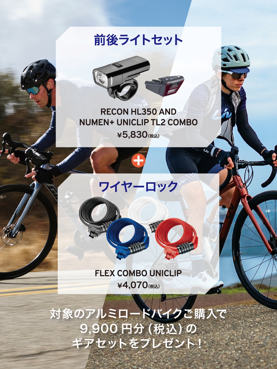 〇キャンペーン内容:対象のロードバイクをご成約で鍵と前後ライトセットの合計9,900円分のパーツをプレゼント