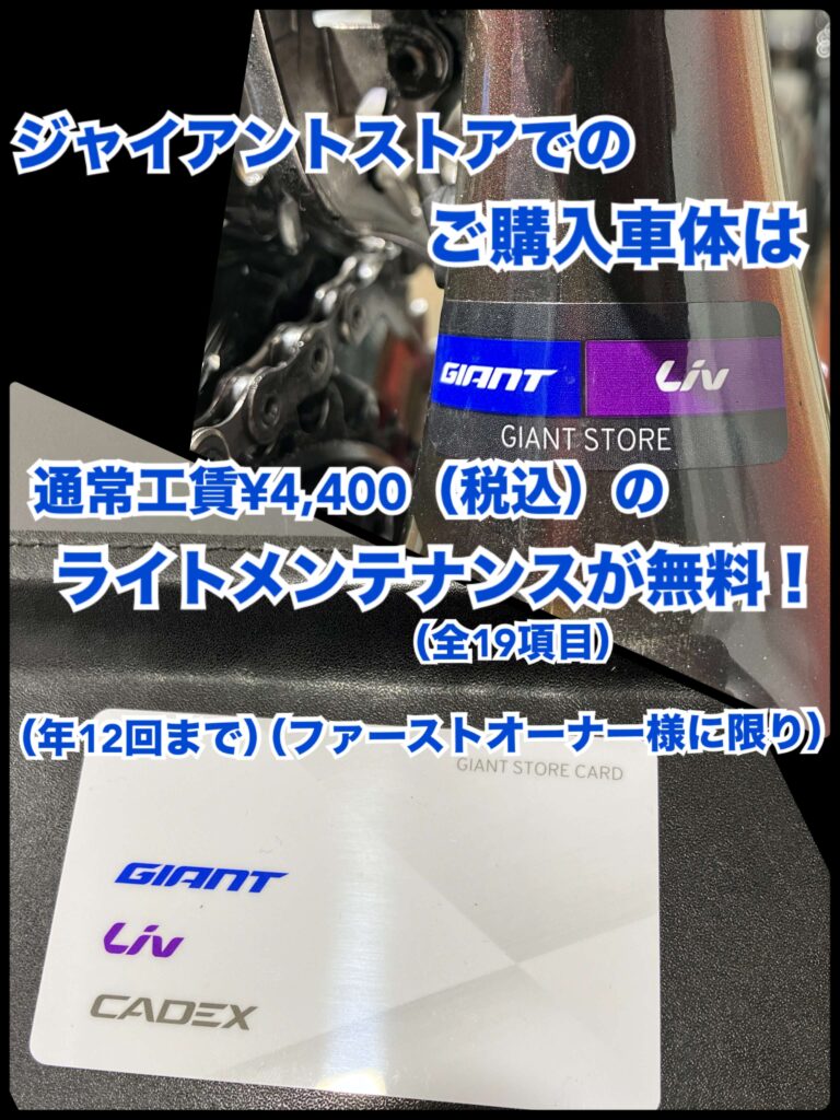 ジャイアントストアでご購入いただいた方はなんとライトメンテナンスが無料でお受けいただけます!(年間12回、ファーストオーナー様に限り)
