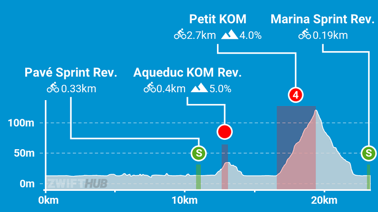10kmを超えたあたりからスプリントポイント、KOM(ショート)、KOM(ロング)があり、最後はスプリントでゴールとなります。