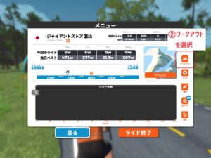 スタート時間になりましたら、画面左下のMENUよりワークアウトを選択して始めて下さい。