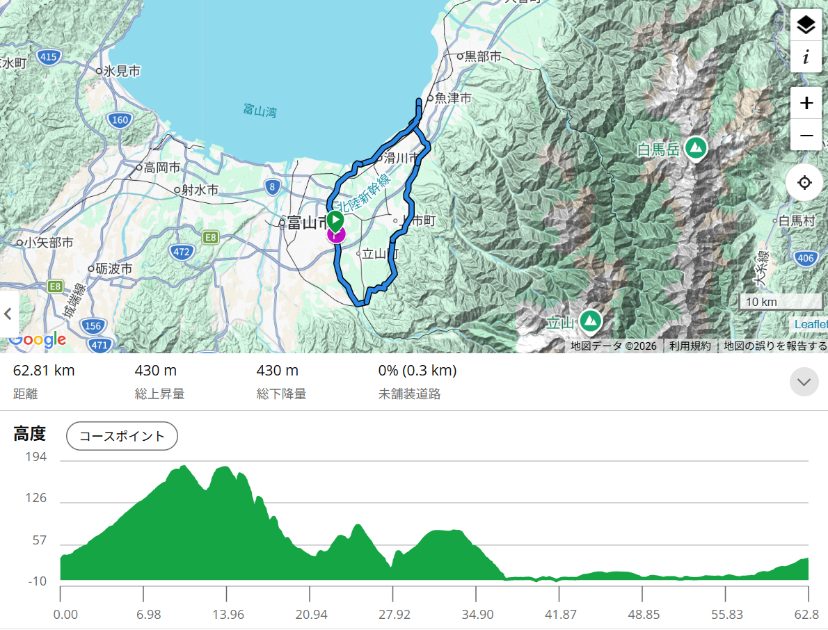 常願寺川公園から白岩川ダムを経て、「海の駅 蜃気楼」でランチを楽しむ、ぐるっと約63kmのルートです。