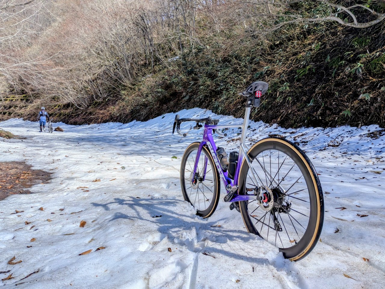 自転車から降りて押して進みます。雪に自転車突き刺して